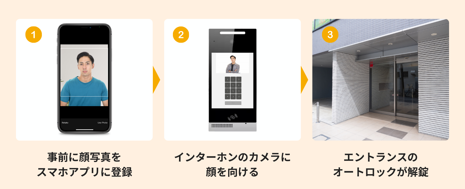 顔認証を利用したオートロックを解錠するための操作は非常に簡単で、次の3ステップで完了します。