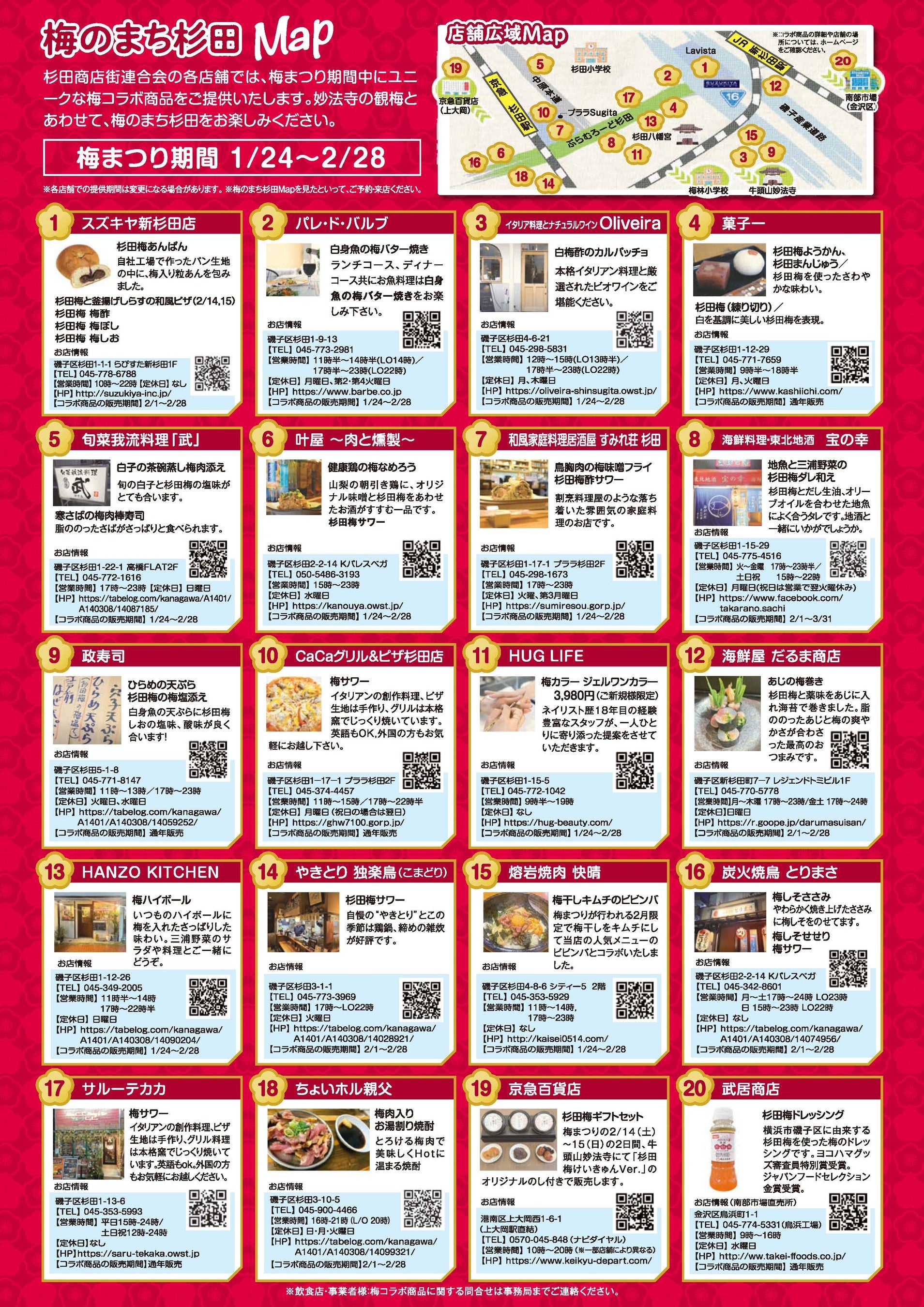 さらに、梅まつり期間中の1月24日(土)~2月28日(土)には、杉田商店街連合会の20店舗が参加する「梅のまちMAP」を配布し、梅にちなんだユニークな商品やサービスで来街者をお迎えします。