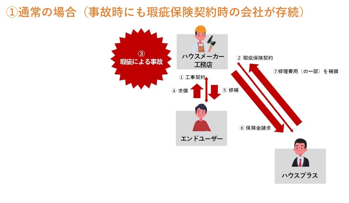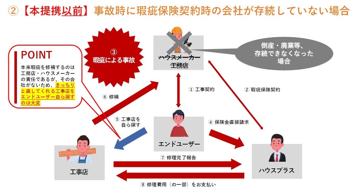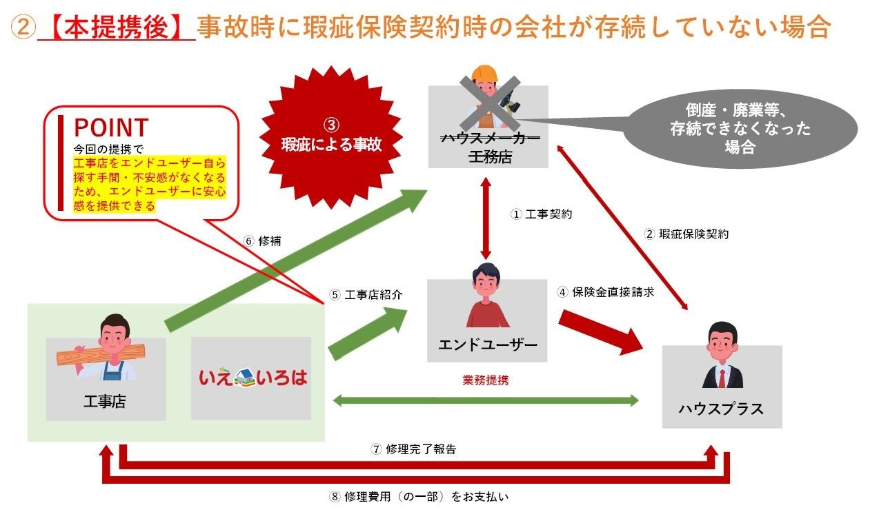 今回の業務提携により、家を建てる際に最初に建てた工務店・ハウスメーカーがハウスプラスの提供する保険に加入している住宅の施主様に対して、万が一瑕疵が見つかった場合に工務店・ハウスメーカーの倒産により瑕疵の修補が受けられない場合に、エンドユーザーは雨漏りなどの対応ができる良質な工事店に直接相談することが可能となります。