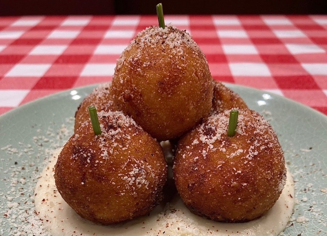 シチリアの郷土料理アランチーニをヒントに作りました。「アランチーニ=小さなオレンジ」という意味ですが、今回はリンゴが中に入っているので小さいリンゴのような見た目にアレンジしています。