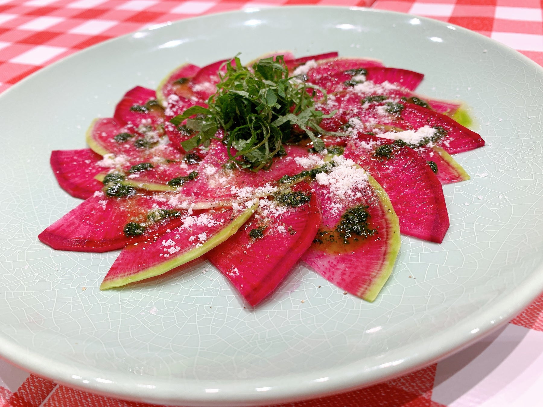 近所のスーパーでは中々お目にかからない、2色の赤大根を薄くスライスしてカルパッチョ風に仕上げました。