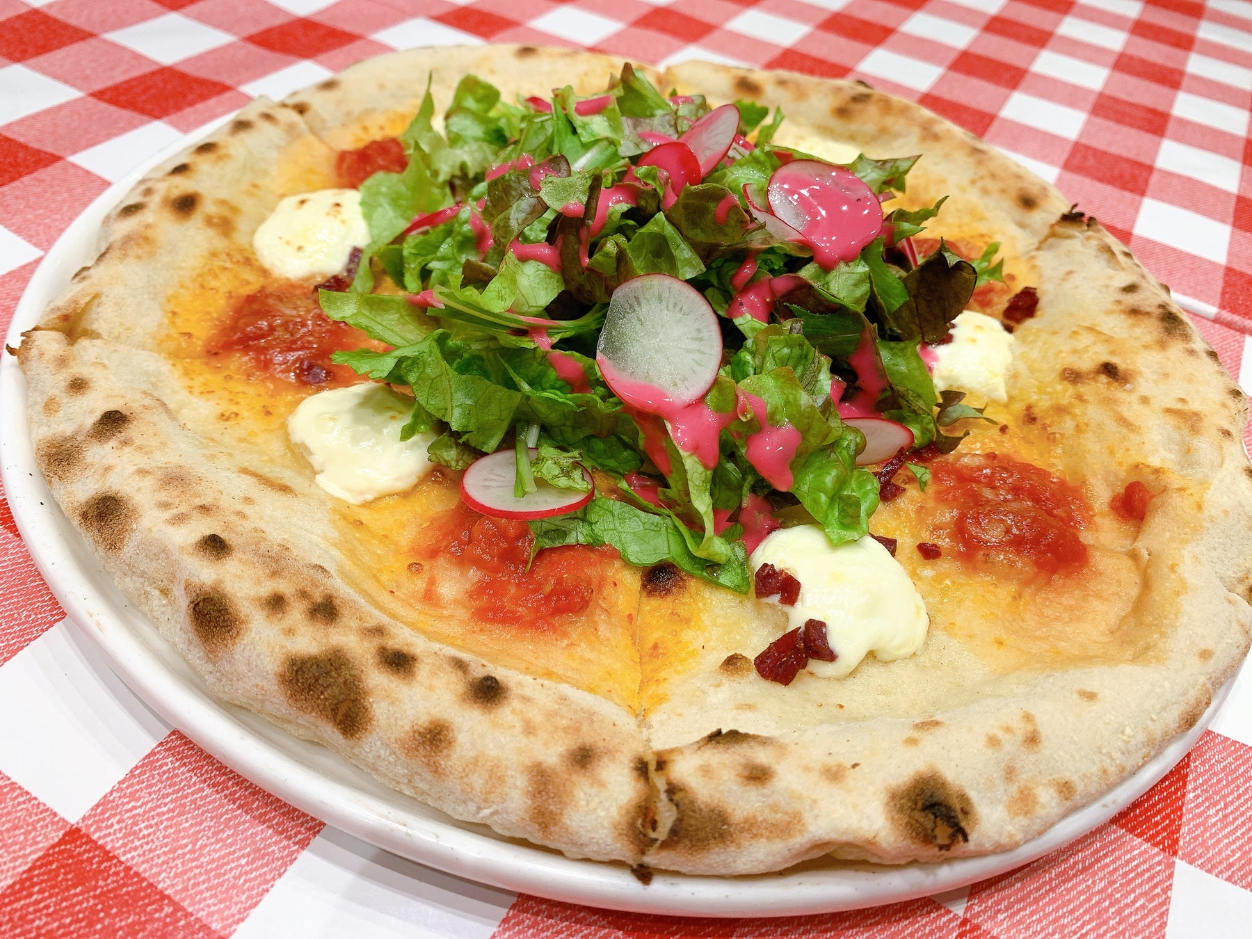細かくした生ハムとパルミジャーノチーズの風味、さらにシャキシャキ野菜と砕いた鷹の爪のピリッとしたアクセントが軽快な、ライトタイプのピッツァです。