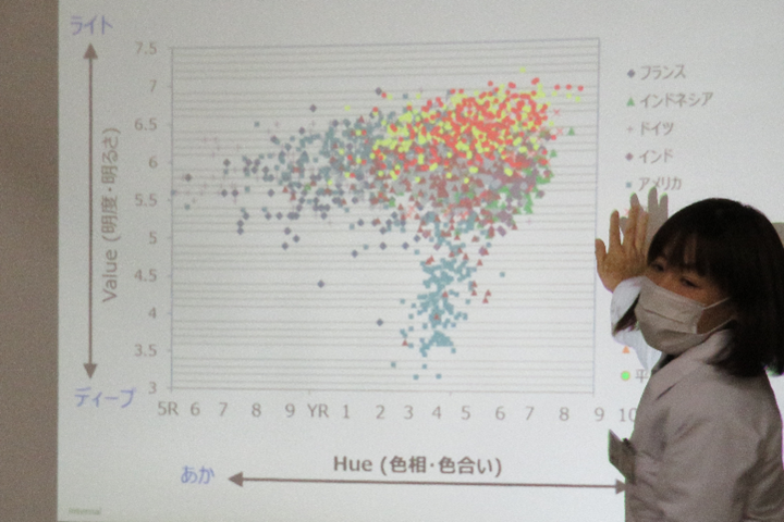 一方で、世界には様々な肌の色をした人々がいます。一見同じ肌色に見えるけれど人によって肌の色は違うということを、肌色を測定する機器とその色相・明度に応じた分布を示すマップを用いて学びました。