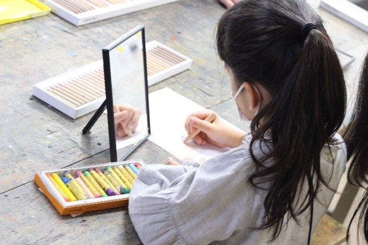 手鏡を見ながら自分でクレヨンを肌にあててみたり、友達同士で色をあてあったり、講師である資生堂クリエイティブのクリエイター達に「このクレヨンの中にもこれだ、という色が無かったら混ぜてみてもいいんだよ」などとアドバイスを受けながら、真剣に自分の色を選んでいました。