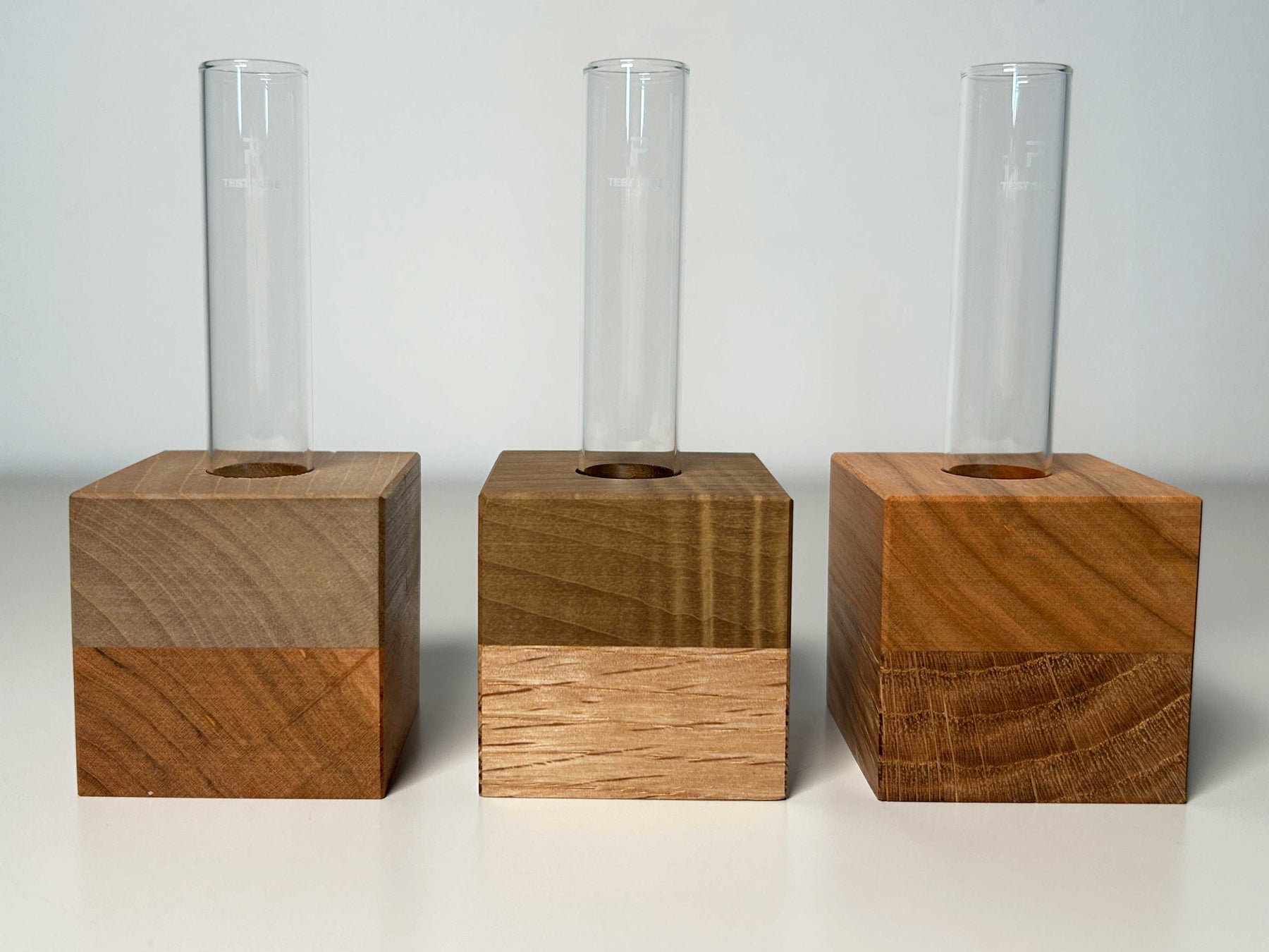 木製の土台とガラス製の試験管を組み合わせたシンプルな一輪挿しですが、それぞれの木の個性が味わい深く、引き込まれてしまうような魅力があります。