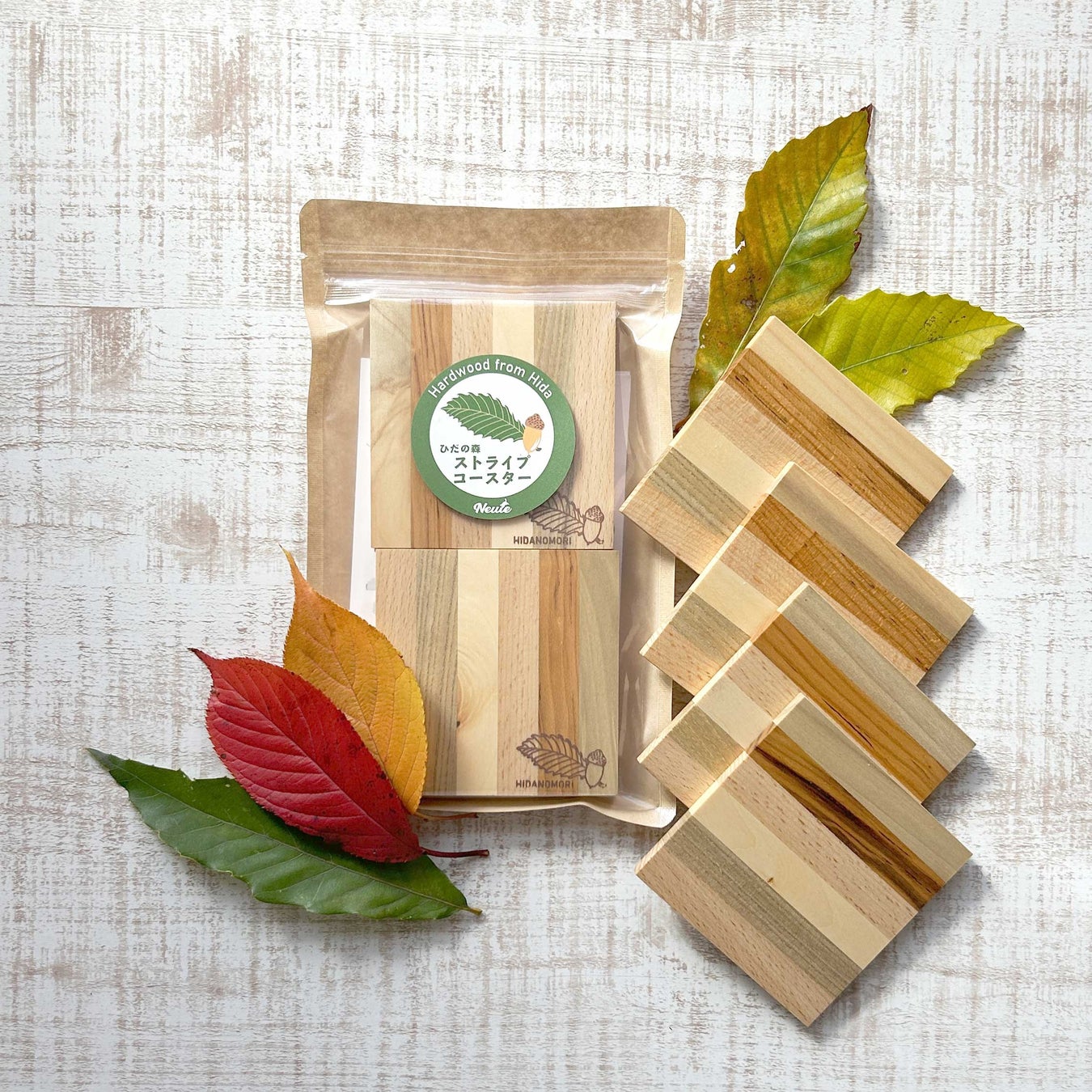 飛騨の森で採れた6種類の広葉樹をつなぎ合わせたストライプ柄コースター