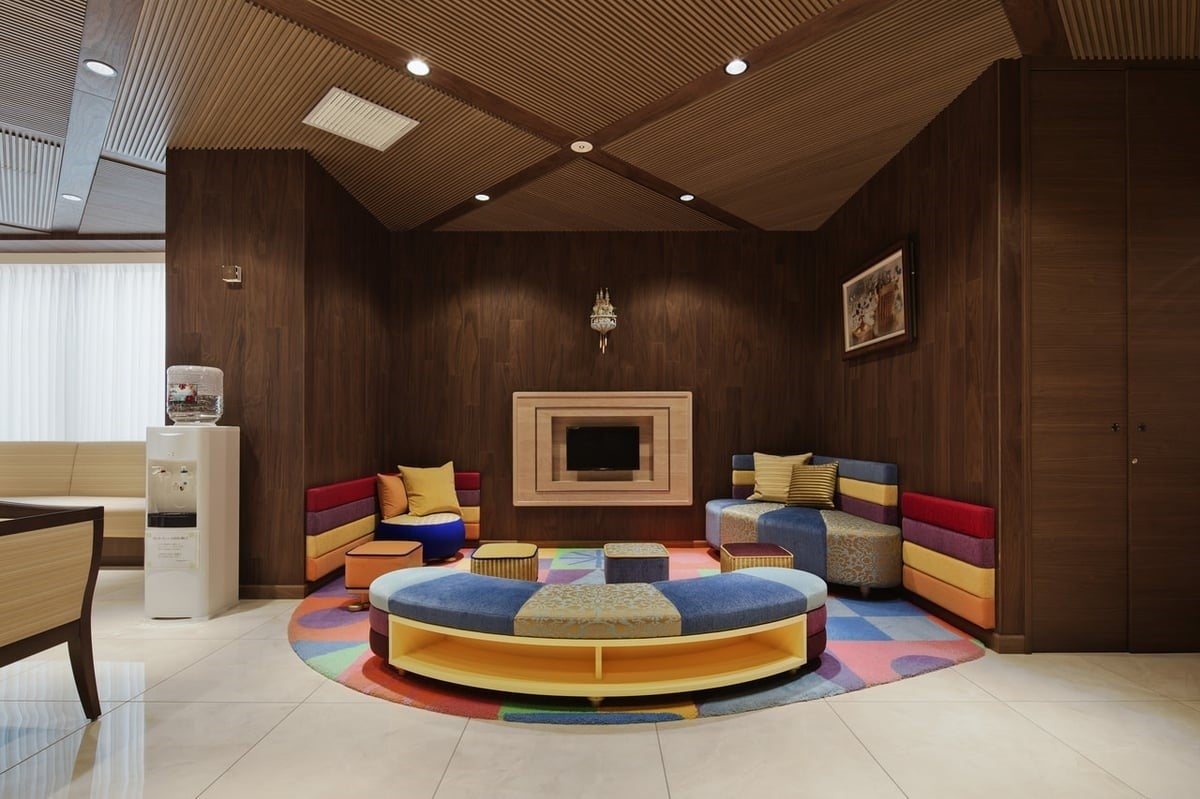 子どもたちが来院を楽しみにしてくれるように、テーマパークのような空間にしました。院内に違和感なく溶け込むよう、カラフルでありながら落ち着いた色調としています。椅子の生地は汚れても中性洗剤で洗い流してきれいにできるよう加工しています。