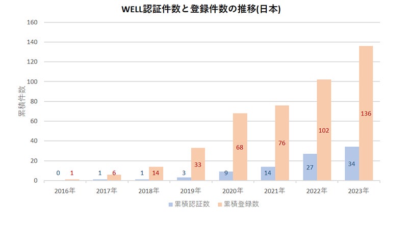 コロナ禍による働き方やオフィスのあり方の変化、健康や安心安全への関心の高まりなどを受け、心身の健康に配慮した建物へのニーズは年々高まっています。日本国内でのWELL認証取得プロジェクトについても、右肩上がりで推移しています。