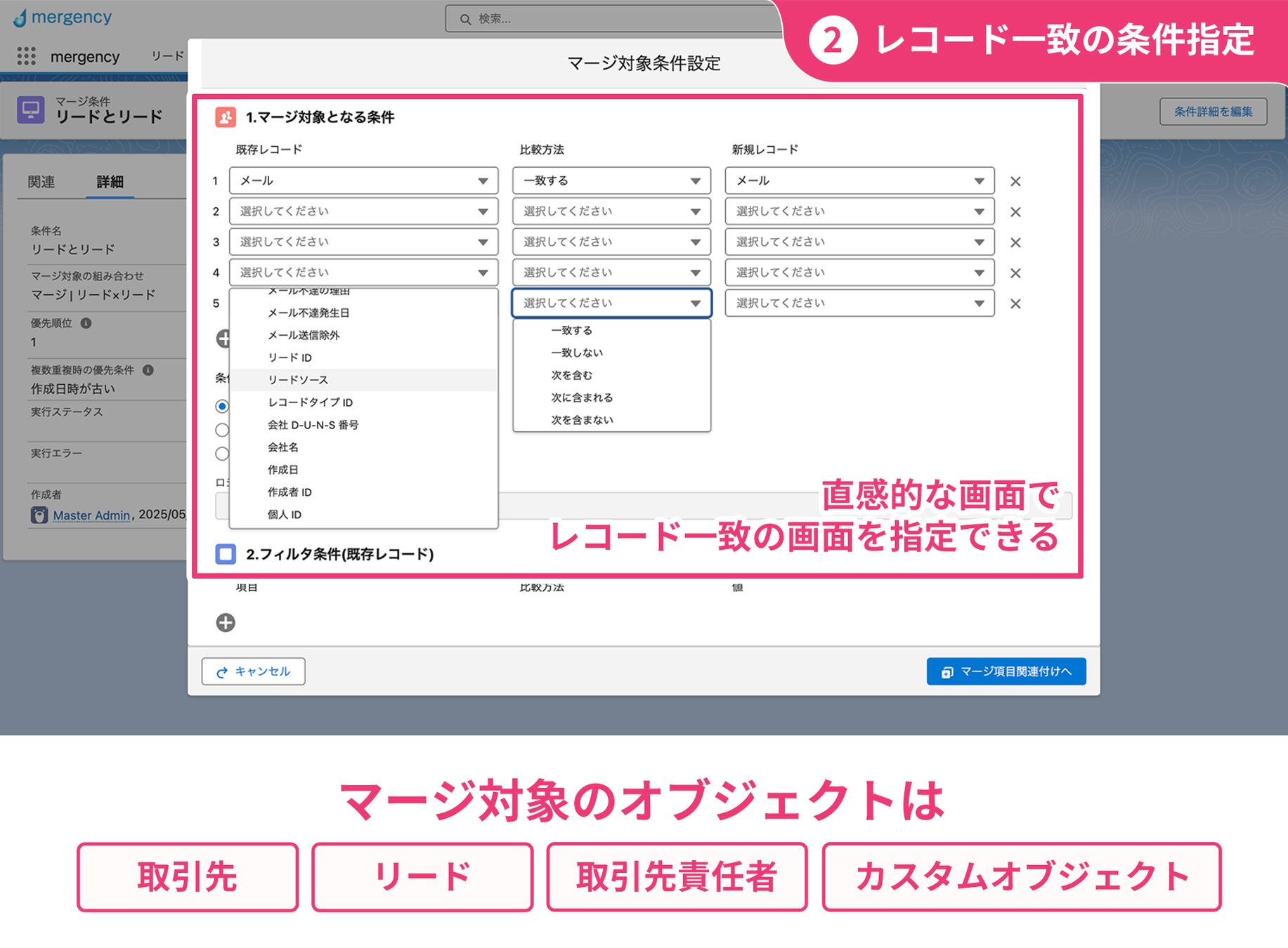 レコード一致条件についても、直感的な画面でレコード一致の条件を指定できます。メール、氏名、会社名、電話番号など、様々な項目での一致判定が可能で、「一致する」「一致しない」「次を含む」「次を含まない」「次と等しい」「次と等しくない」などの詳細な条件設定により、各企業の運用に最適化したマージルールを構築できます。