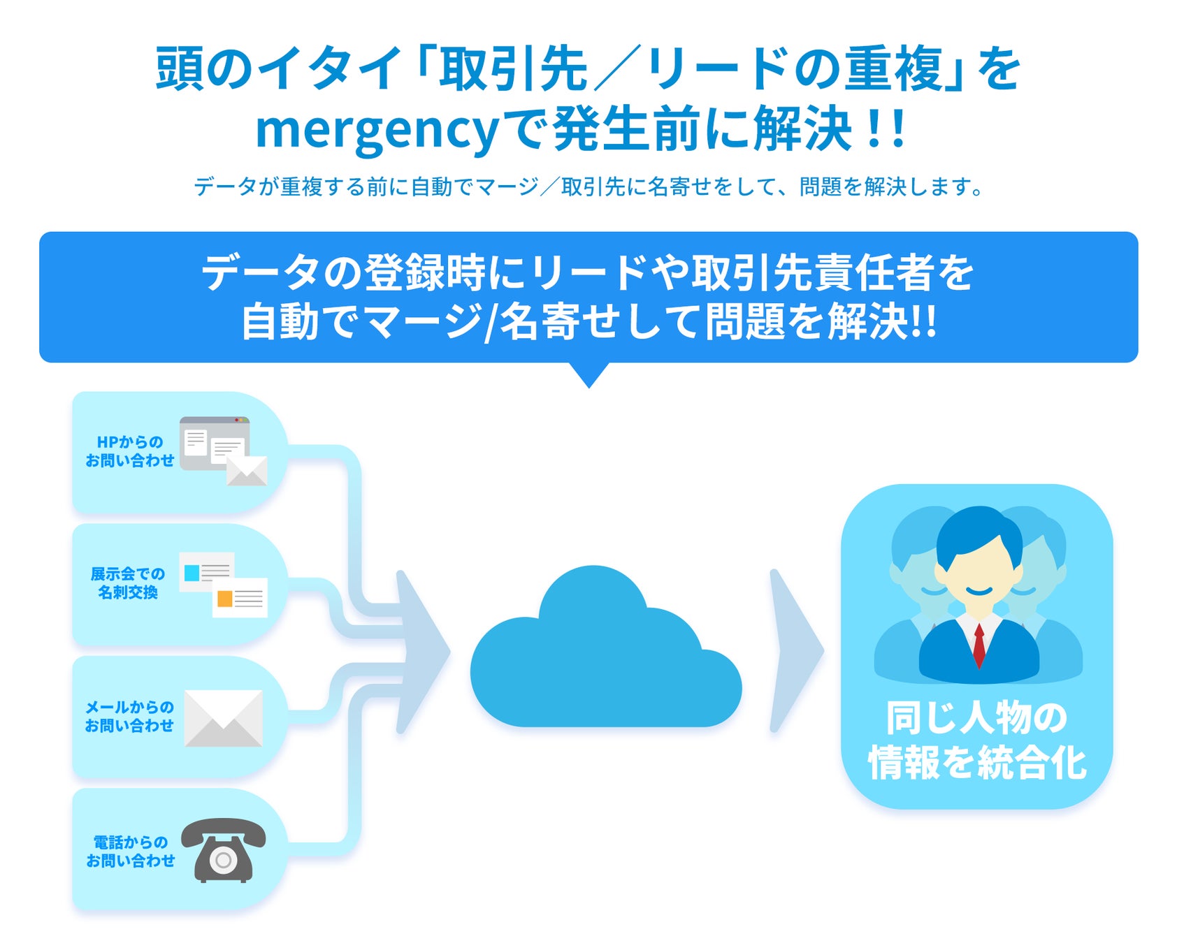 mergencyは、データが重複する前に自動でマージ処理を実行し、問題の発生を未然に防ぐサービスです。データの登録時にリードや取引先責任者を自動でマージ・名寄せして問題を解決します。