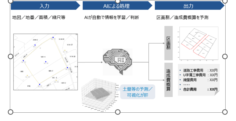造成くんは、入力された土地情報に基づき、AIが区画割と造成費用を予測します。