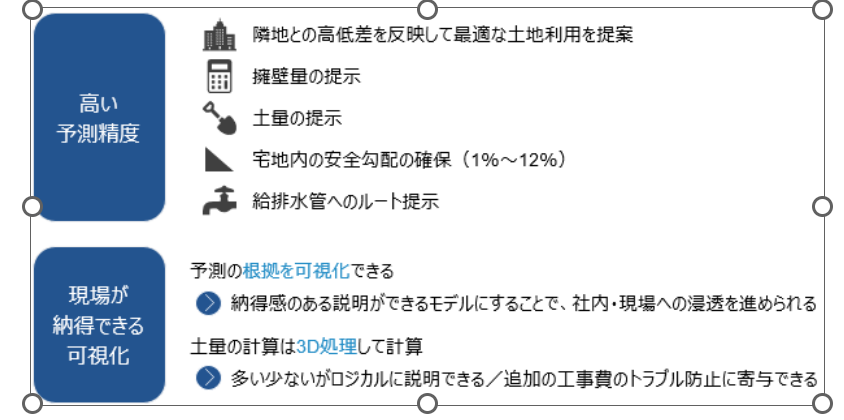 当社は、造成くんの特徴宅地開発における最適な区画割りと、その最適な区画割りに対応する土木工事費の積算業務という二つの作業で求められる、以下のような高い予測精度と可視化機能を具備しているものと考えております。