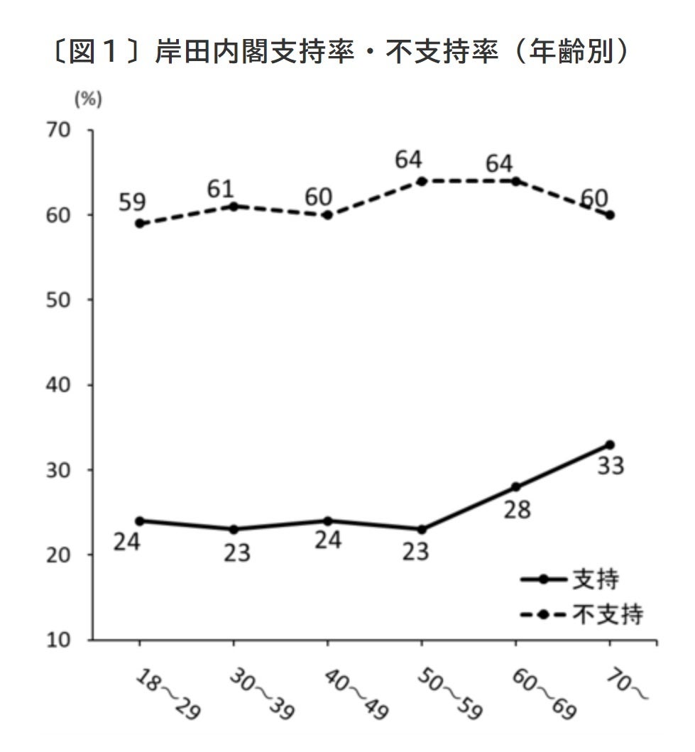 1.岸田内閣支持率26%、不支持率が全年代6割前後の多数