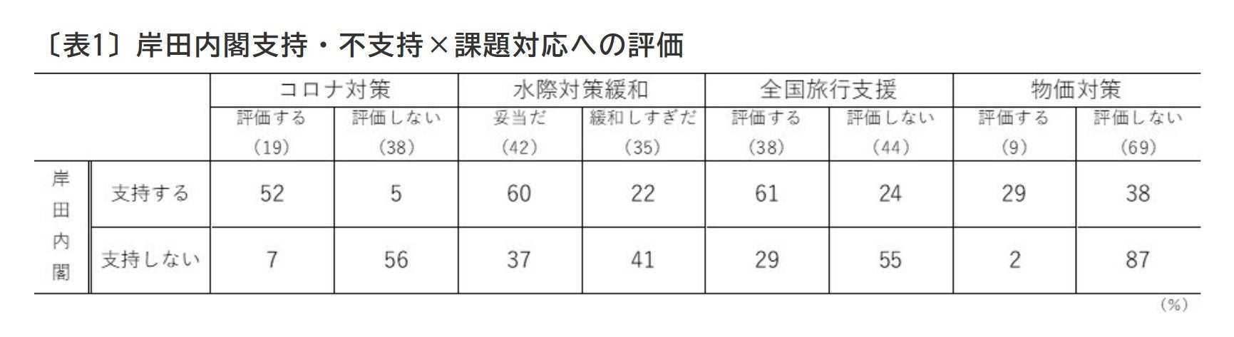 内閣不支持が支持を大きく上回った要因は何なのか。時宜の政治諸課題への政権の対応をどう評価するかと、内閣支持・不支持とのクロス結果で確認してみましょう。【表1】は、「新型コロナウィルス対策」、「水際対策(入国制限)の緩和」、「全国旅行支援」、「物価対策」への評価を、内閣支持層と不支持層とに分けて集計したものです。表中、それぞれの課題に関する「評価する」・「評価しない」の下の( )内に表示した数値は、全体の結果に相当します。