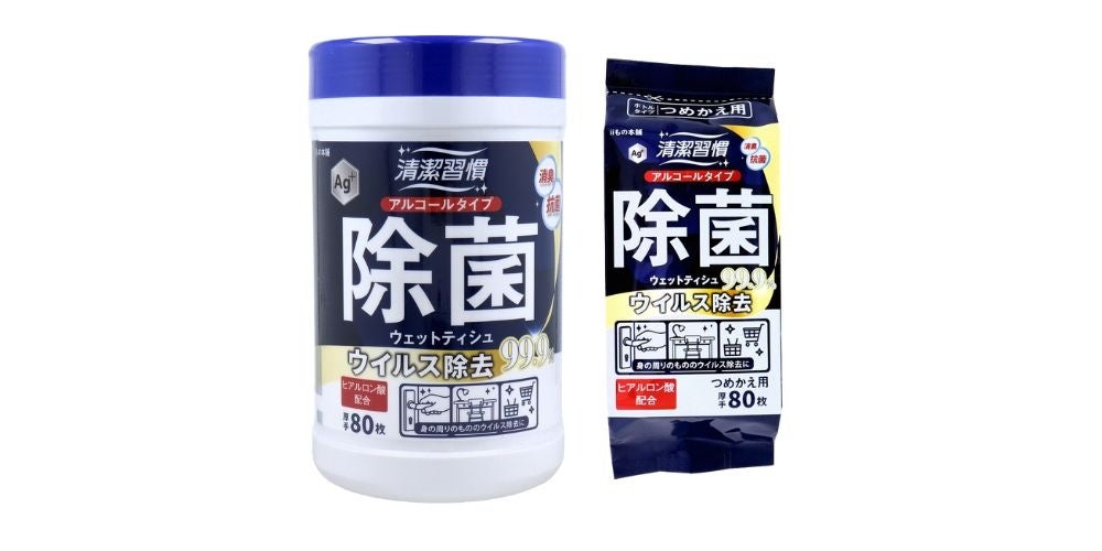 そこで、大変好評をいただいている「清潔習慣 アルコールタイプ 除菌ウェットティシュ ボトルタイプ」にウイルス除去成分をプラスした製品を発売いたしました。こちらの製品1つで除菌だけでなくウイルス対策も可能になりました。