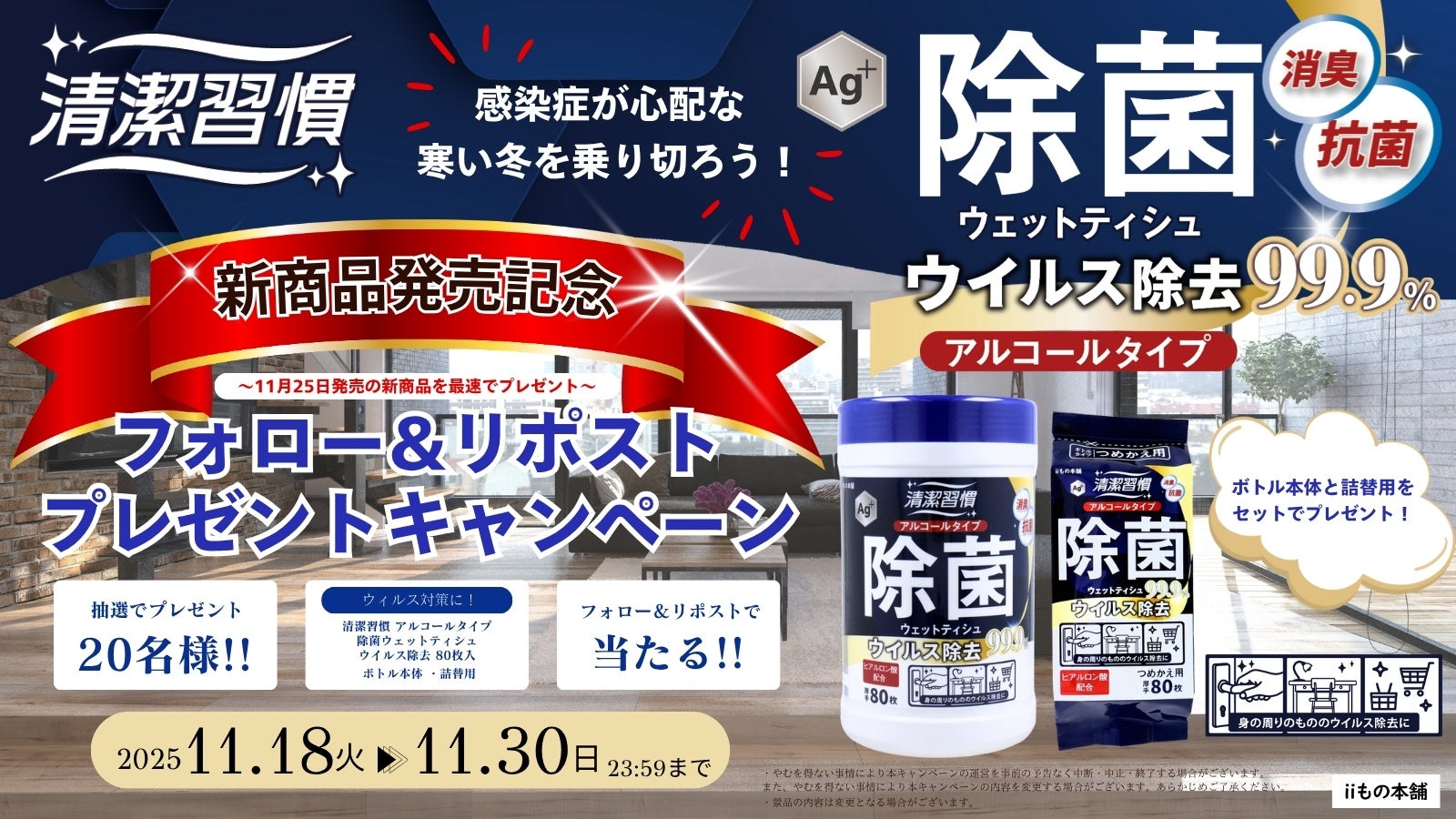iiもの本舗では2025年11月18日より11月30日23:59まで公式Xにて新商品「除菌ウェットティシュ ウイルス除去 80枚入」発売記念プレゼントキャンペーンを実施中です。