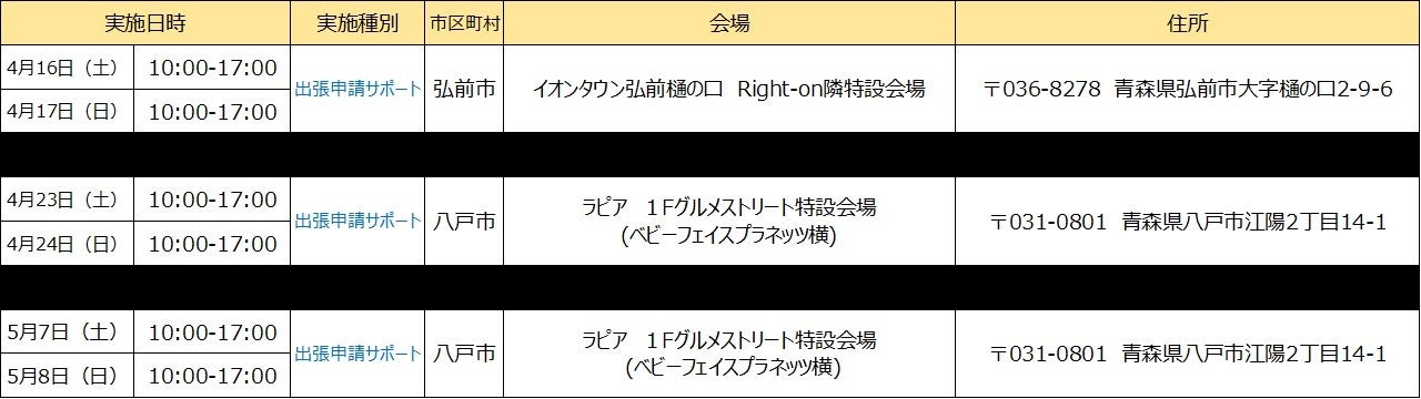※開催場所の調整状況や新型コロナウィルスの感染状況等により、「出張申請受付」及び「出張申請サポート」の開催を中止・延期、または実施内容が変更となる可能性がございます。