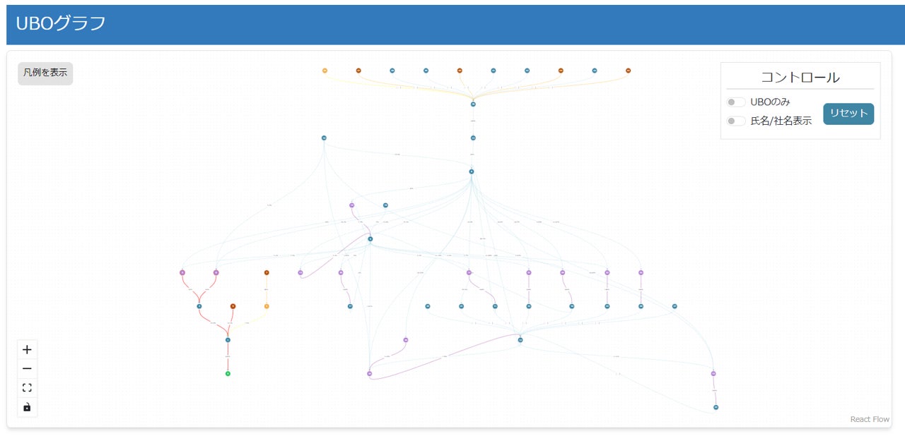 間接株主や少数保有株主を含めたすべての株主構成をビジュアル化するグラフ機能を提供します。このグラフにより、複雑な資本関係を含む企業の株主構造を一目で把握することが可能です。グラフは色分けされており、上場企業、個人株主、そして法人株主を簡単に区別できるようになっています。