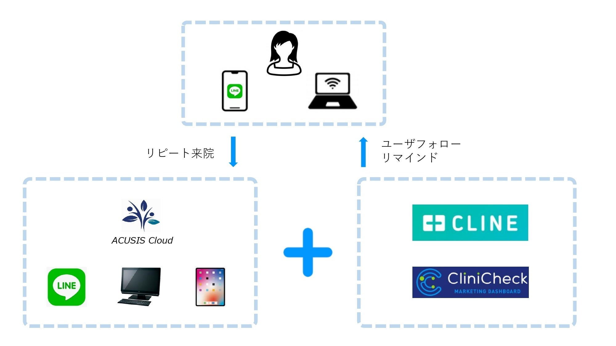 ACUSIS Cloud をすでに導入されているクリニック様、もしくは今後導入を検討されているクリニック様は、ぜひこの機会にCLINEとの連携も視野に置いていただけますと幸いです。