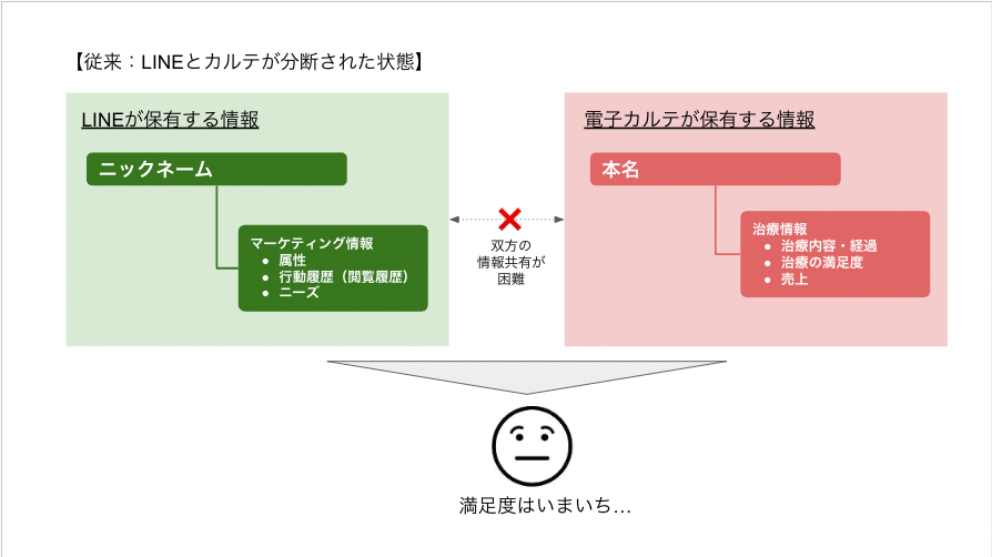 なぜでしょう?障壁になっているのはカルテの存在です。医療を提供するにあたって、カルテには本名を記載する必要があり、来院に際しては、必ずどこかのタイミングでLINEのニックネームと本名を紐付ける必要があります。今まで、そこは人力に頼らざるを得ませんでした。