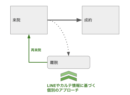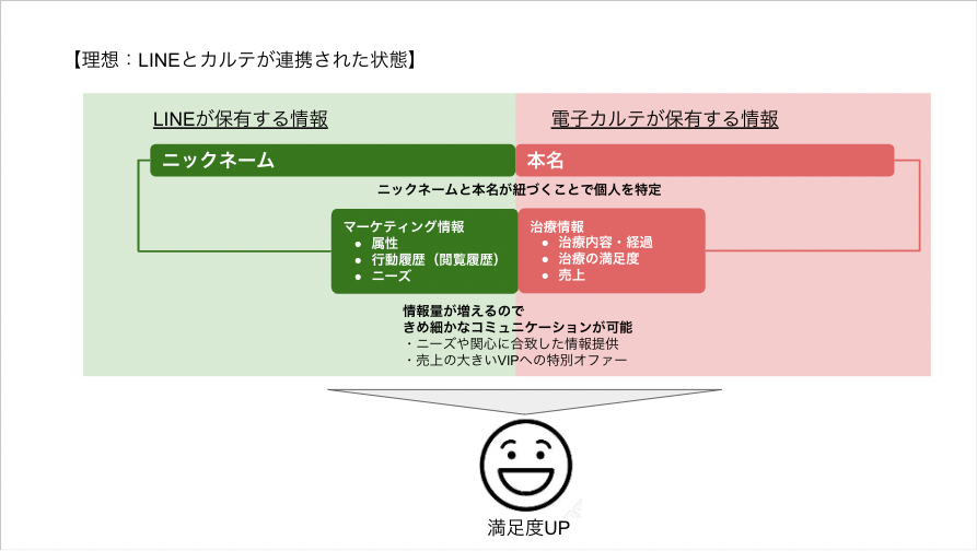 例えば「来院したものの治療に至らなかった」というカルテ上の情報がLINEのアカウントと紐づくことで、個人を特定することができます。これによって、その方に最適化した情報を再度個別に送ることができます。