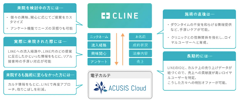 これを自動化し、LINE上のやりとりとカルテ情報の一元管理を可能にするのが、今回ご紹介する「ACUSIS Cloud × CLINE」です。