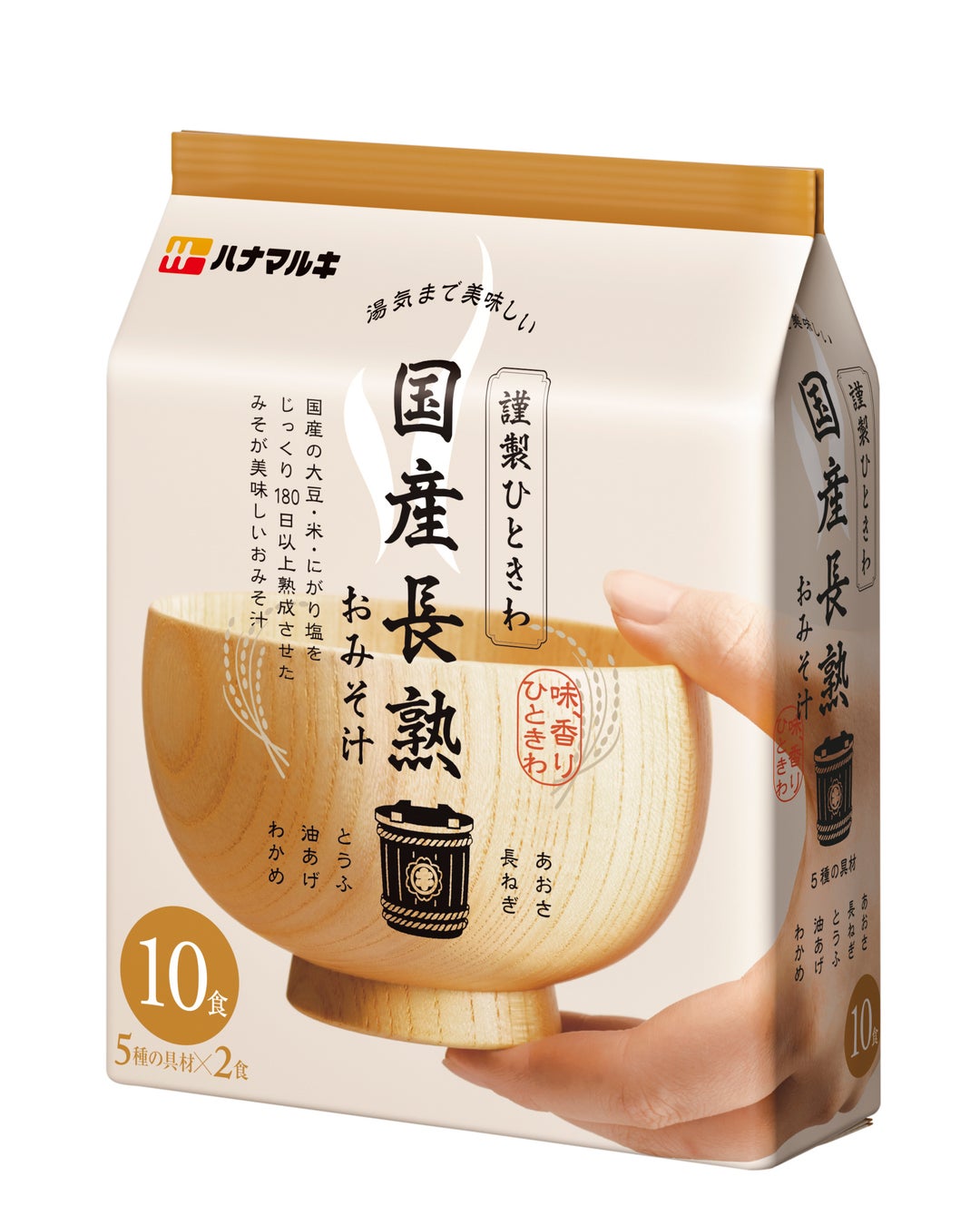 ハナマルキ2023年春の新商品 3月1日より発売 国産原料使用のみそを長期熟成させた、謹製即席みそ汁 ~「謹製ひときわ 国産長熟みそ汁10食」 新登場!~