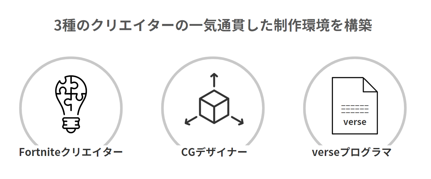 我々の強みの一つは、UEFNマップクリエイターによるワールド制作に加えて、3DCGクリエイターがモデリング制作を担当し、さらにFortnite内に独自のゲーム性を組み込むVerseプログラマーが制作に関与します。