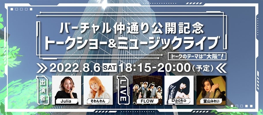 公開初日には、人気インフルエンサー、Julia、そわんわんが大阪の魅力を語るトークショーとFLOW、Daoko(DJ set)、當山みれいが出演するバーチャル音楽ライブを開催します。イベント前には、Juliaが大阪観光の魅力を伝える動画をYouTube(Julia in style)に投稿し、SNSとメタバース空間の連携による観光プロモーションの実証を行います。