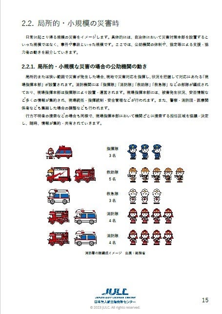 本カリキュラムは、静岡県焼津市地域防災課の実践的な災害対応運用に基づいた内容です。焼津市地域防災課は公助機関として、無人航空機組織構成や注意点、飛行訓練を含めた実際の運用経験を2015年から積み重ね、現在では弊社と協定を締結し、JULCの教材を活用した登録講習機関として職員や消防団員の育成を行っています。こうした実績に基づき、公助機関としての立場から災害・事故支援者に求められる行動や必要な対応、手動/自動操縦の訓練方法など、公助機関と支援者が共に活動する際の実用的な情報をJULCと連携することで本カリキュラムが完成しています。