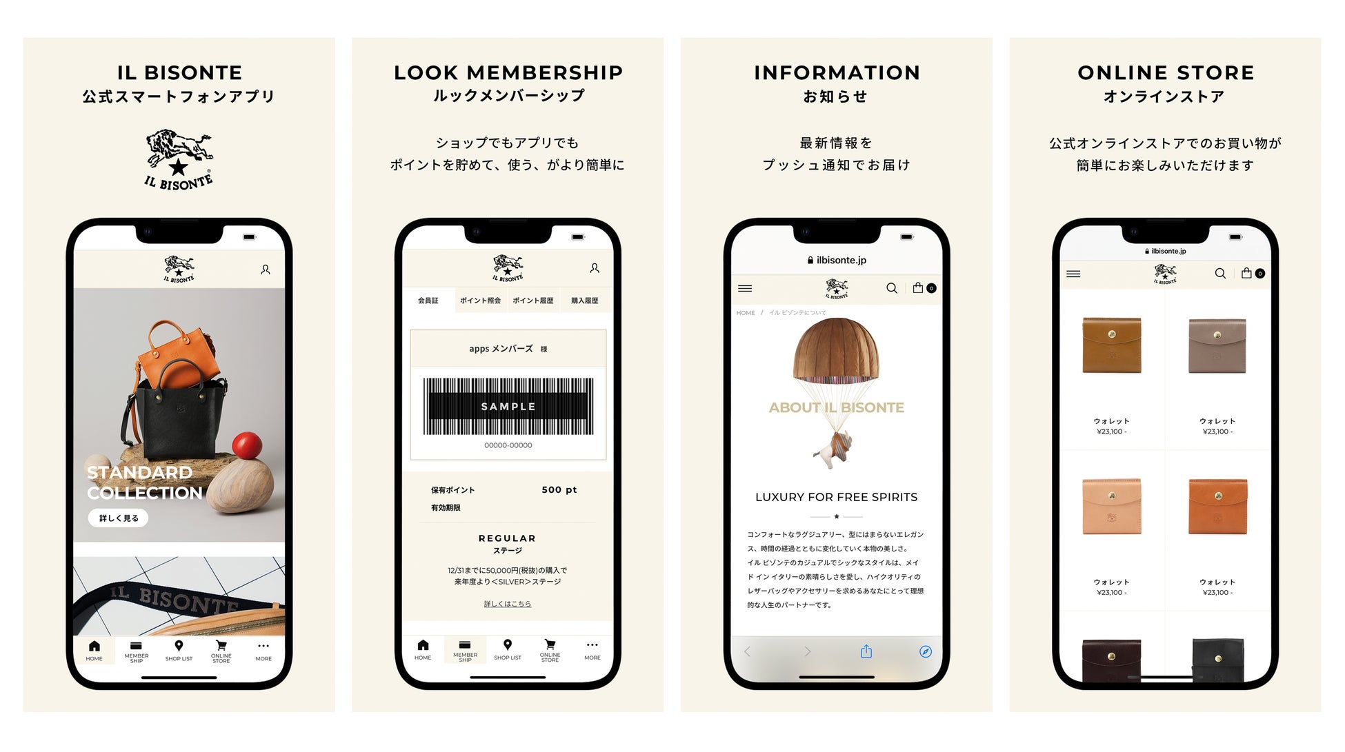 IL BISONTE APPは、イル ビゾンテならびにルックグループの共通ポイントサービス“LOOK MEMBERSHIP”対象店舗で会員証としてご利用いただけるだけでなく、イル ビゾンテの最新ニュースや様々なコンテンツをご覧いただきながら、公式オンラインストアからお買い物が便利にお楽しみいただけます。