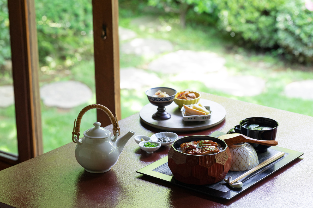 メニュー:①ひつまぶし ②お吸いもの ➂竹の子とふきの煮つけ ④煮酢和え ⑤煮味噌
