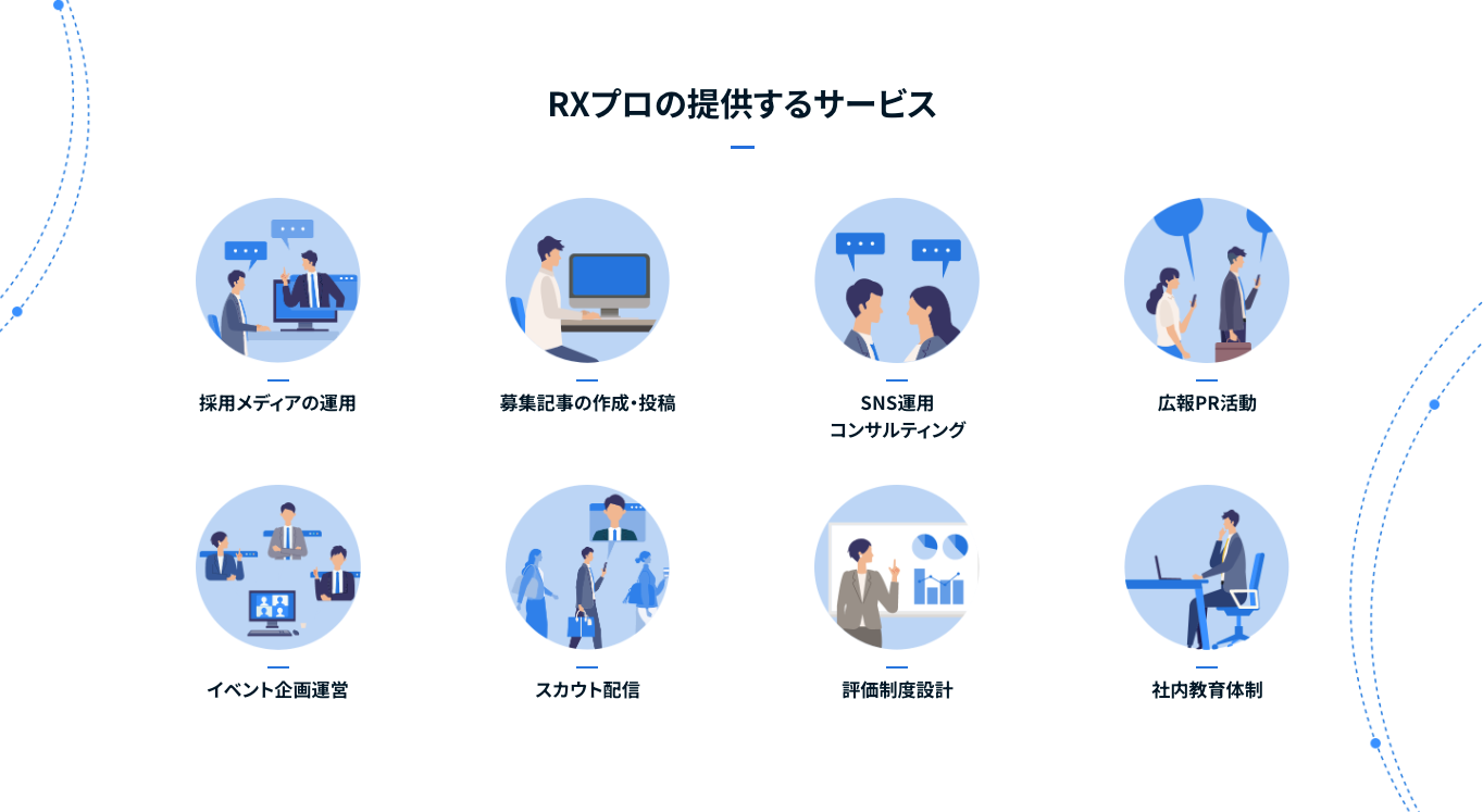 RXプロでは、採用マーケティングに力を入れる企業が増える中、日本一の「Wantedly」運用実績を主軸とした採用メディアの運用やダイレクトリクルーティング・スカウト代行などの母集団形成支援、採用要件や選考基準選定からオンボーディングまで一貫した採用戦略支援など、人事部門の課題を解決しております。伴走型コンサルティングで、内省化まで支援し企業の採用資産形成を実現します。