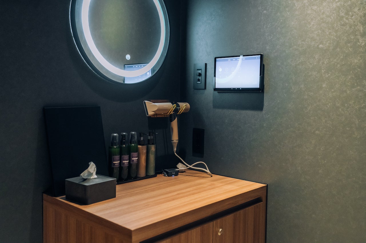 女性専用のパウダールームはご予約時間後も自由に利用可能なため、身支度に時間をかけたい女性にもゆったりサウナをお楽しみいただけます。エントランスには電源つきのテーブルを設置。ご予約時間前後で利用可能なため、利用時間までの待機や待ち合わせ、PCでの作業なども可能です。