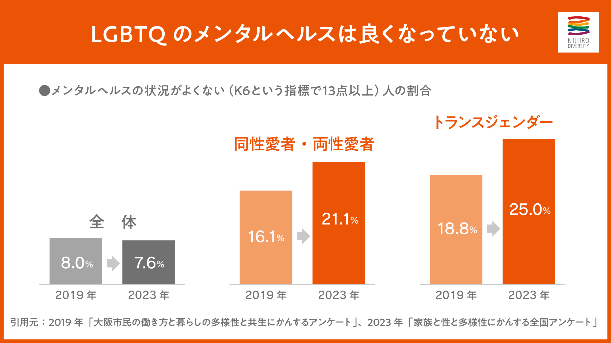 LGBTQのメンタルヘルスは、一般のデータと比較して、2倍から3倍は悪い、と言われています。この10年余り、企業や行政の取り組みは進み、LGBTQのニュースは増えました。しかし、LGBTQのメンタルヘルスは、残念ながら、まったく良くなっていません。