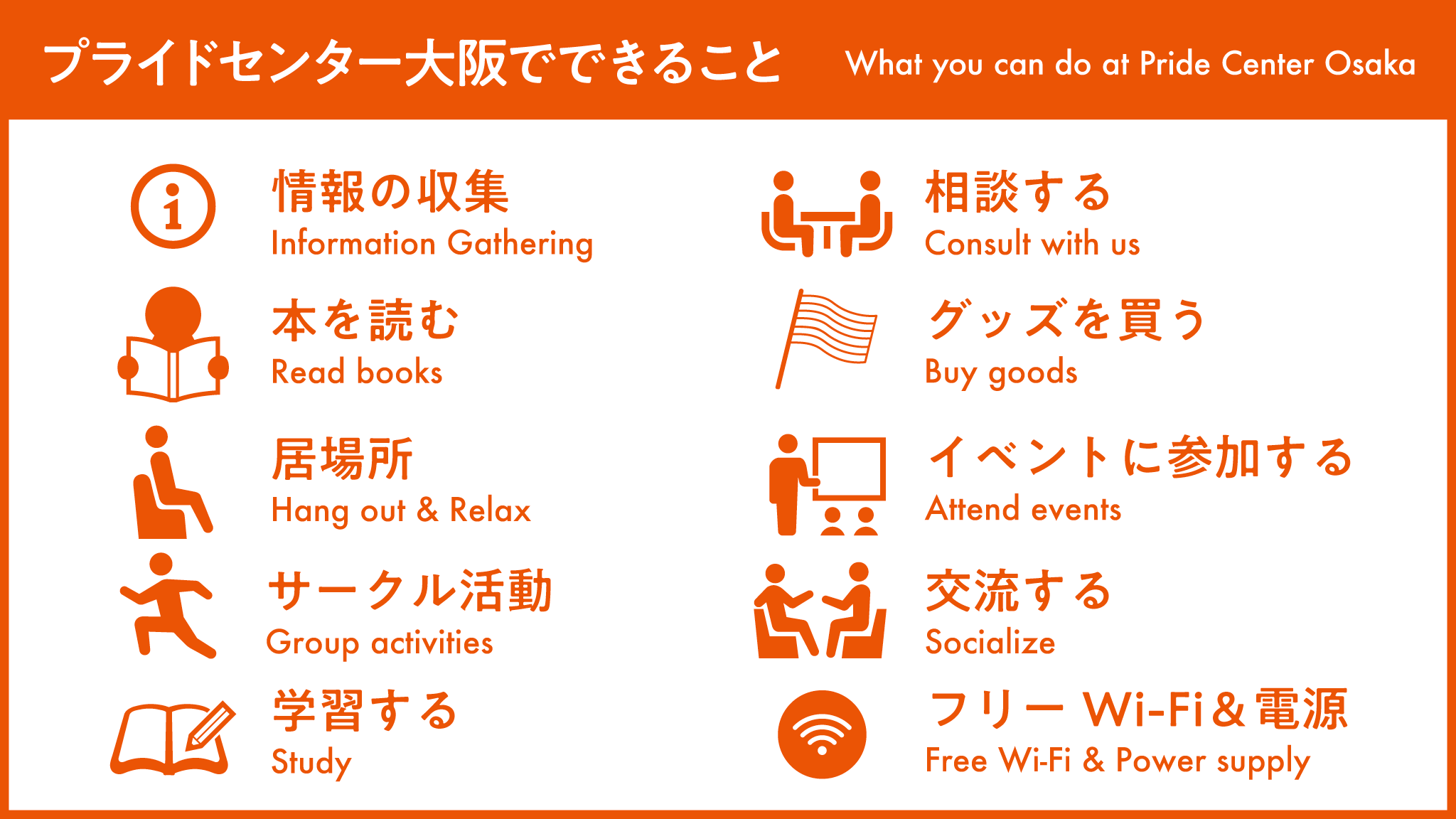 プライドセンター大阪は、家賃と水光熱費(約35万円/月 × 2フロア)、オープンスペース運営の人件費、相談業務の委託費、図書購入費など、年間で約2,500万円の維持費がかかっています。今回のクラウドファンディングによるご寄付は、以下のような取り組みのために、大切に使わせていただきます。