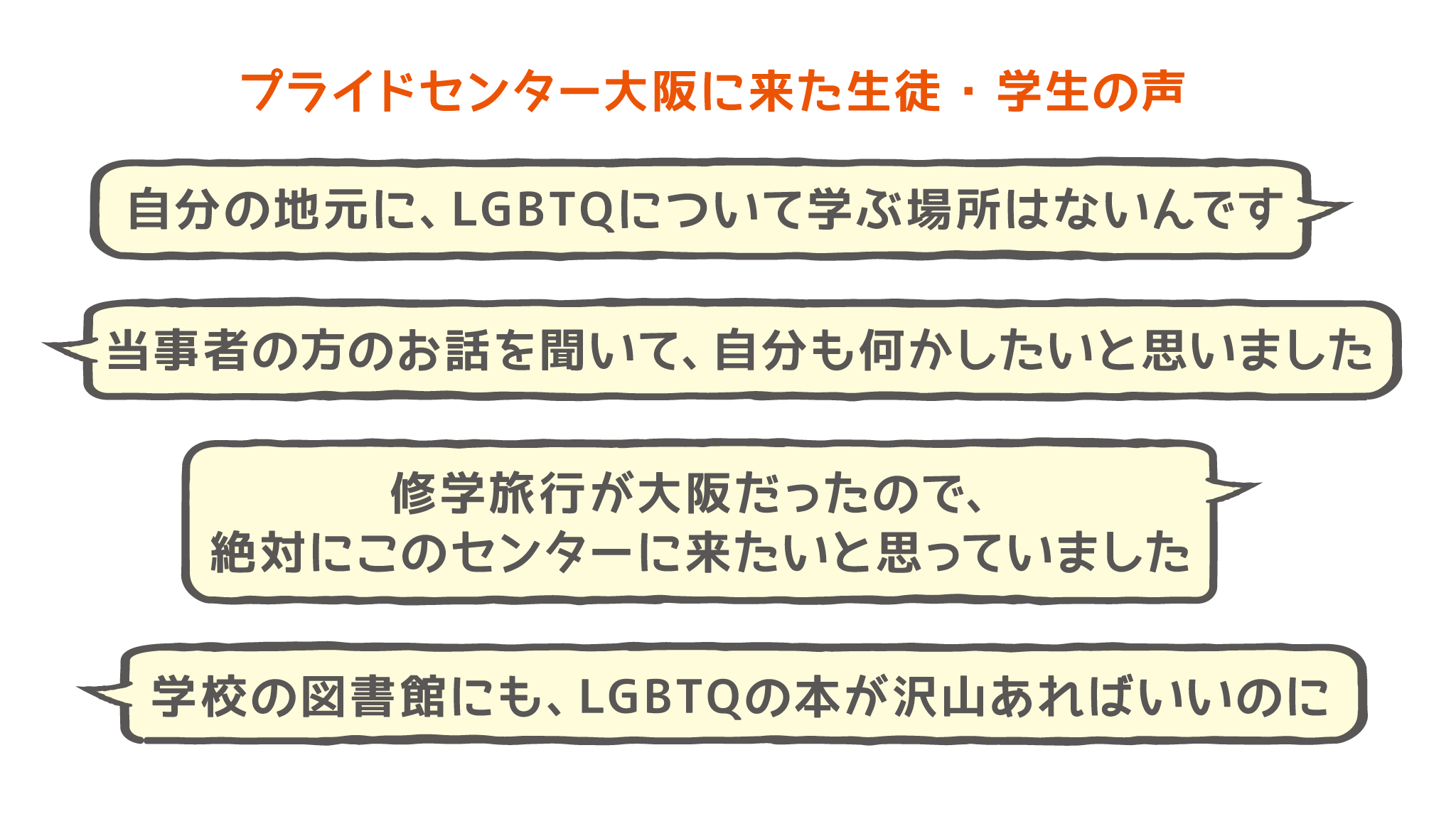 「プライドセンター大阪は、週に4日、15時から20時まで開館しています。逆に言えば、それ以外の時間は空いています。しっかりプログラムを作ったら、LGBTQについて学びたい中高生の受け入れがもっとできるのではないか? 今こそチャレンジすべきだ、と思いました。」