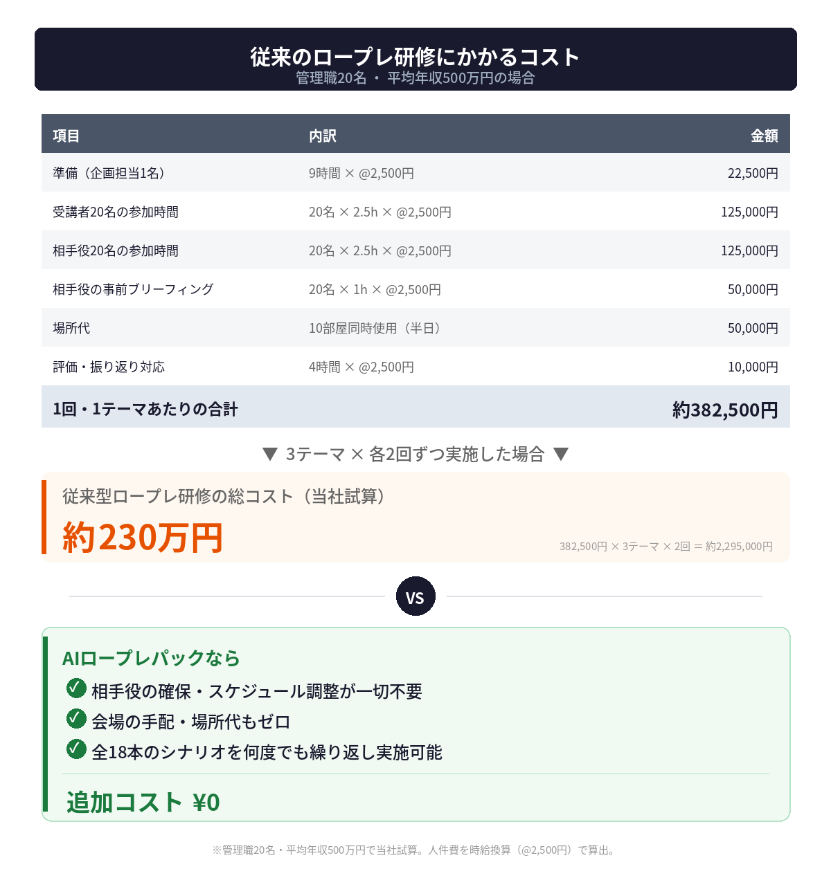 例えば、管理職20名に対して上司・先輩が相手役を務める形で、3つのテーマのロープレを各2回ずつ実施しようとした場合、シナリオ設計・相手役の準備・当日運営・会場費・評価対応まで含めると、人件費だけで約230万円以上のコストが発生する試算になります。(※管理職20名・平均年収500万円で当社試算)