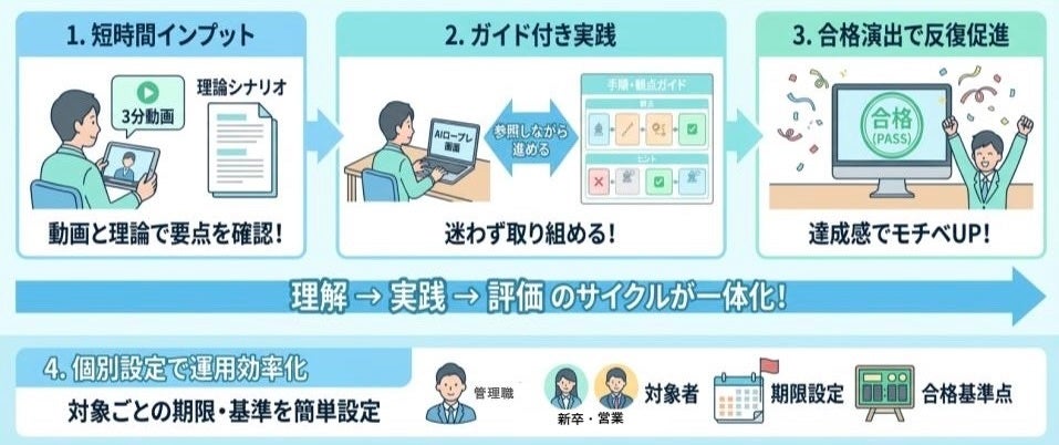 5)“AIロープレ単体”ではなく、学習設計(理解→お手本→実践→評価)まで一体化