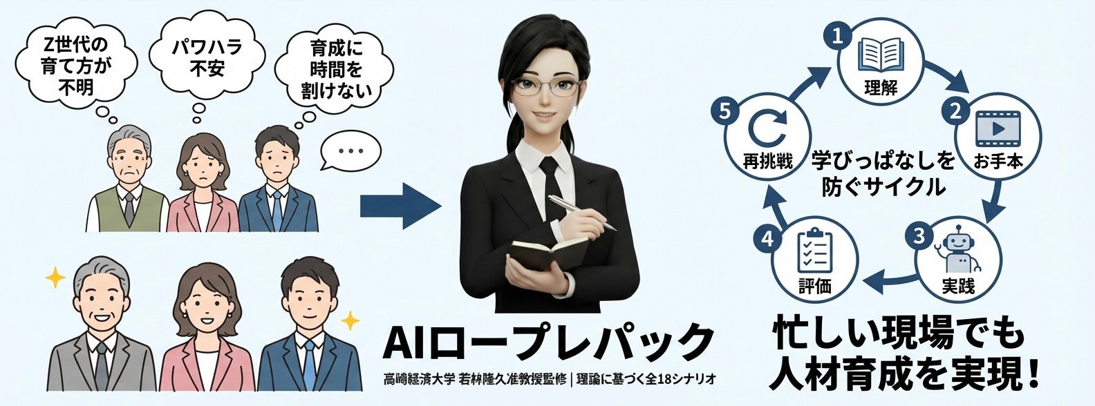 ① 大学准教授監修 × 理論に基づくシナリオ設計 高崎経済大学 若林隆久准教授の監修のもと、全100本のシナリオを設計。「知っている」から「できる」への行動変容を促すため、理論→お手本→実践→評価→再挑戦の学習サイクルが一体化された構成で、学びっぱなしを防ぎます。