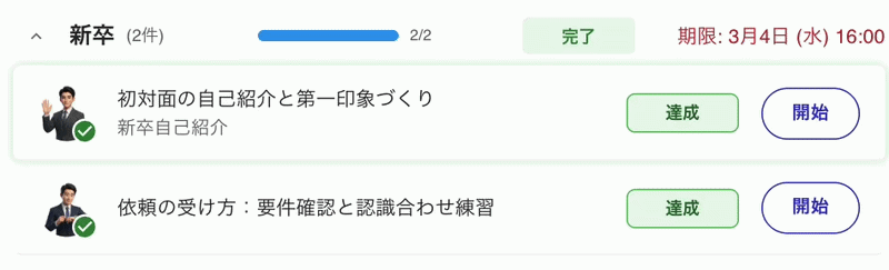 ② 導入の手間ゼロ、すぐに始められるパッケージ設計 シナリオ設計・相手役の手配・評価基準の作成は一切不要。パッケージを選ぶだけで、最短即日から研修を開始できます。対象者への期限設定や合格基準の設定も管理画面から簡単に行えます。