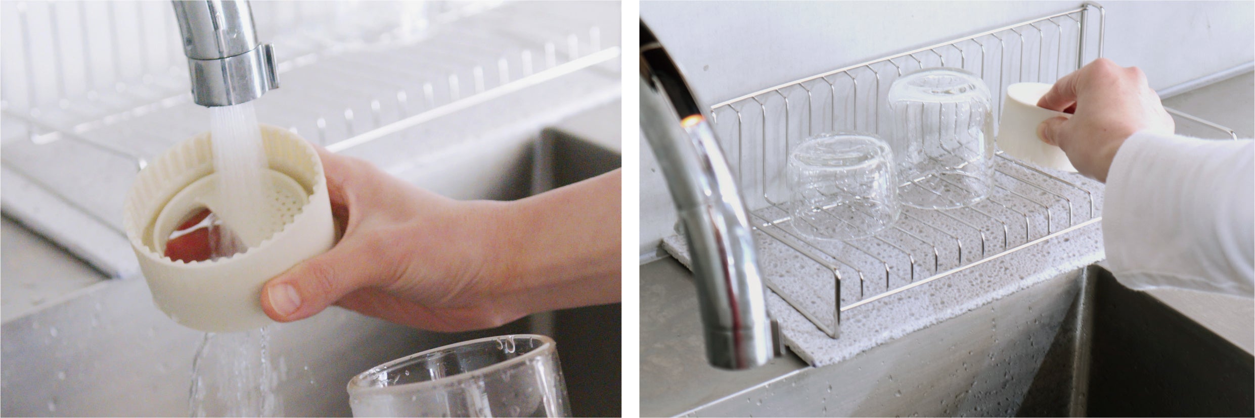 従来の急須に比べて、シンプルなデザインのカルムはお手入れが簡単です。ガラス素材は茶渋がつきにくく、洗った後の乾燥も早いのが特徴です。従来の茶こしにあたるシリコーン製フィルターも凹凸を極力減らすことで、編み目に詰まりにくく、清潔に保ちやすいデザインに仕上げています。