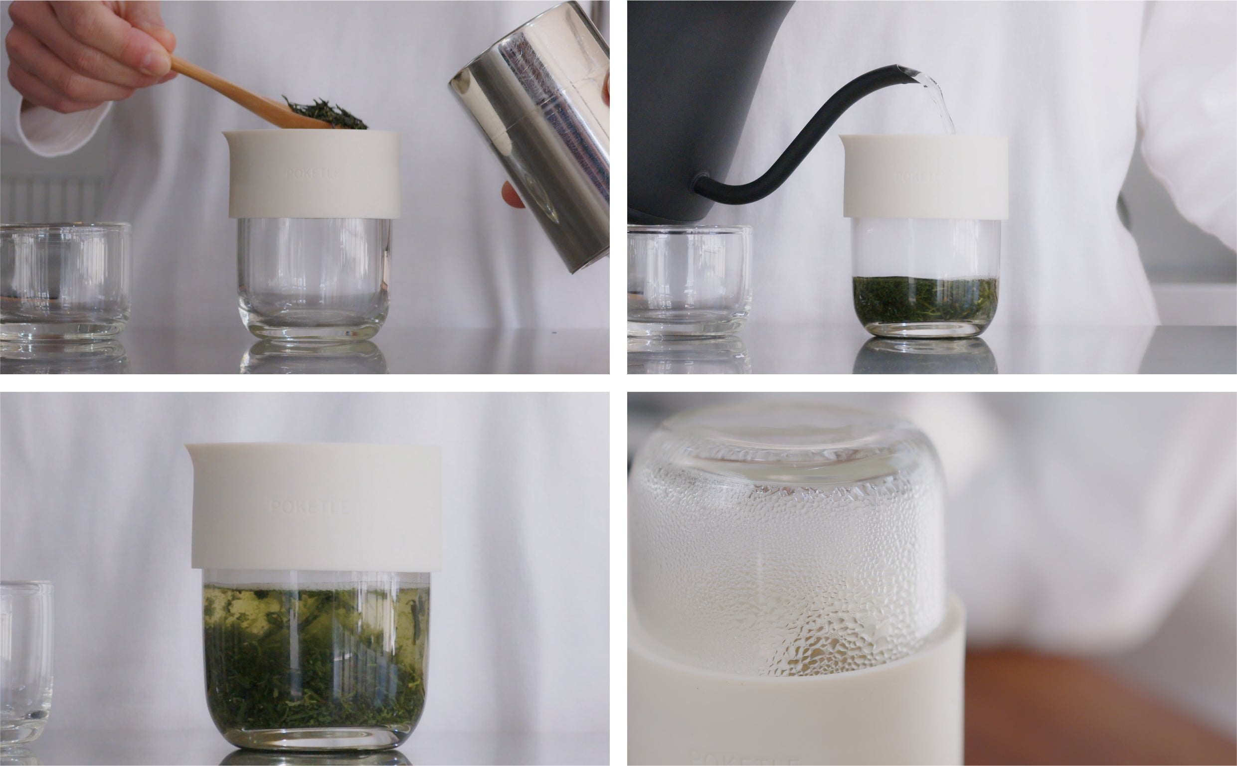 茶葉を入れ、お湯を注ぐとポットの中で茶葉が繊細に舞い広がります。その後コップで蓋をすると、蒸らされてポツポツと水滴がつきはじめます。ガラス製だからこそ、お茶ができあがるまでのプロセスを目で楽しめます。