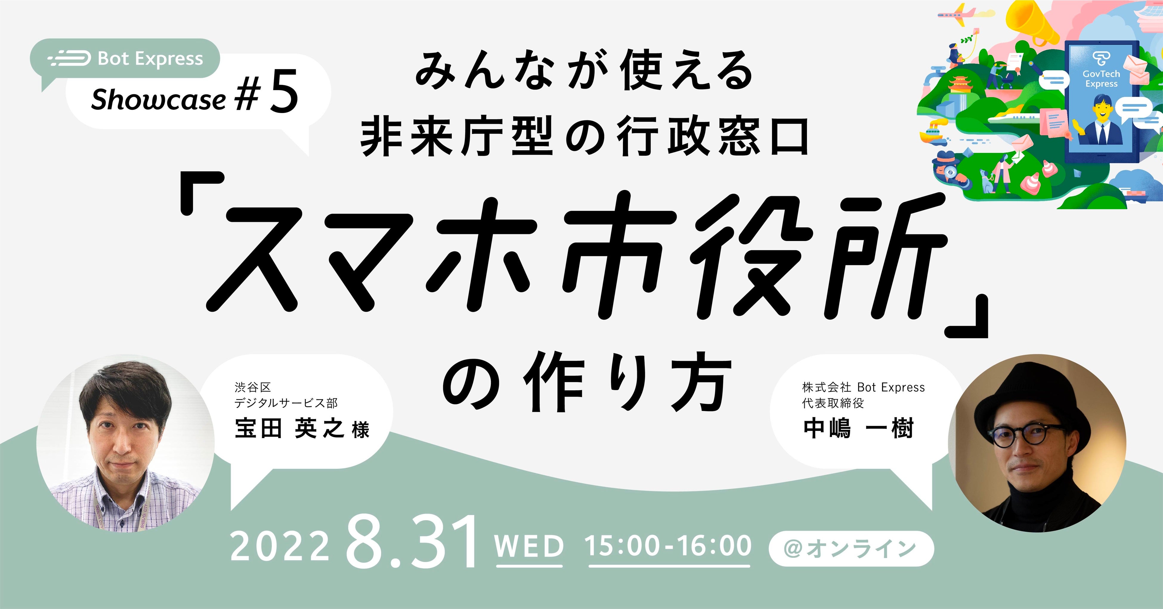 株式会社Bot Express(本社:東京都港区、代表取締役:中嶋 一樹、以下 Bot Express)は、官公庁専用対話型アプリケーション「GovTech Express」を活用し、スマホ市役所を実現している官公庁・地方自治体の事例を共有するイベント「Bot Express Showcase」の第5回目を、8月31日(水)15時より開催することをお知らせいたします。