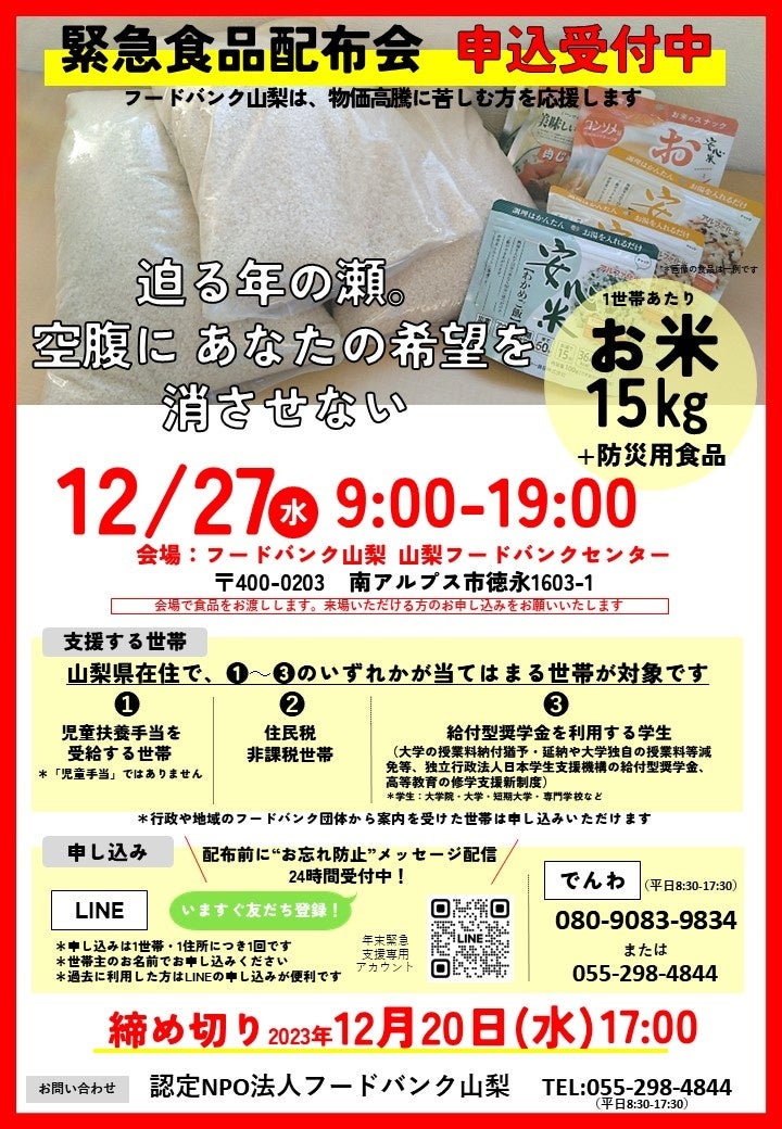 【緊急】-物価高騰に立ち向かう食品の架け橋- 12/27(水)フードバンク山梨は緊急食品配布会を実施します