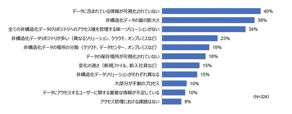 非構造化データを管理する上での課題は、前年調査から引き続き「データに含まれている情報が可視化されていない」(40%)が首位となりました。前年と比較すると、2023年の調査では2位の「非構造化データの量の膨大さ」が5ポイント上昇し38%となる一方で、「アクセス管理における課題はない」と回答した企業は3ポイント減の8%となり、ほとんどの企業が非構造化データのアクセス権限の管理に課題を抱えていることが、改めて浮き彫りとなりました。(図4)