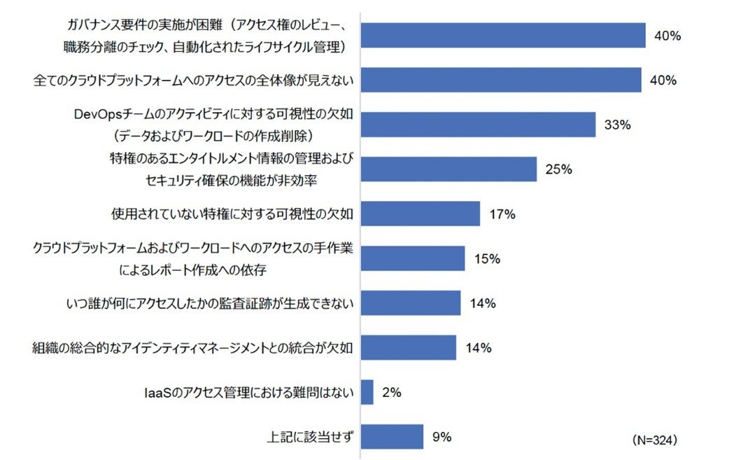 また、IaaS環境全体のアクセス管理に関連して、「全てのクラウドプラットフォームへのアクセスの全体像が見えない」(40%)「ガバナンス要件の実施が困難(アクセス権のレビュー、職務分離のチェック、自動化されたライフサイクル管理)」(40%)といった課題を抱えると回答した企業が4割となっています。「IaaSのアクセス管理における難問はない」と回答した企業は僅か2%にとどまっており(図3)、クラウド投資が拡大するに伴い、システム全体に散在するアクセス権限および職務権限分離を透過的に管理することに課題を抱えている状況が確認されました。