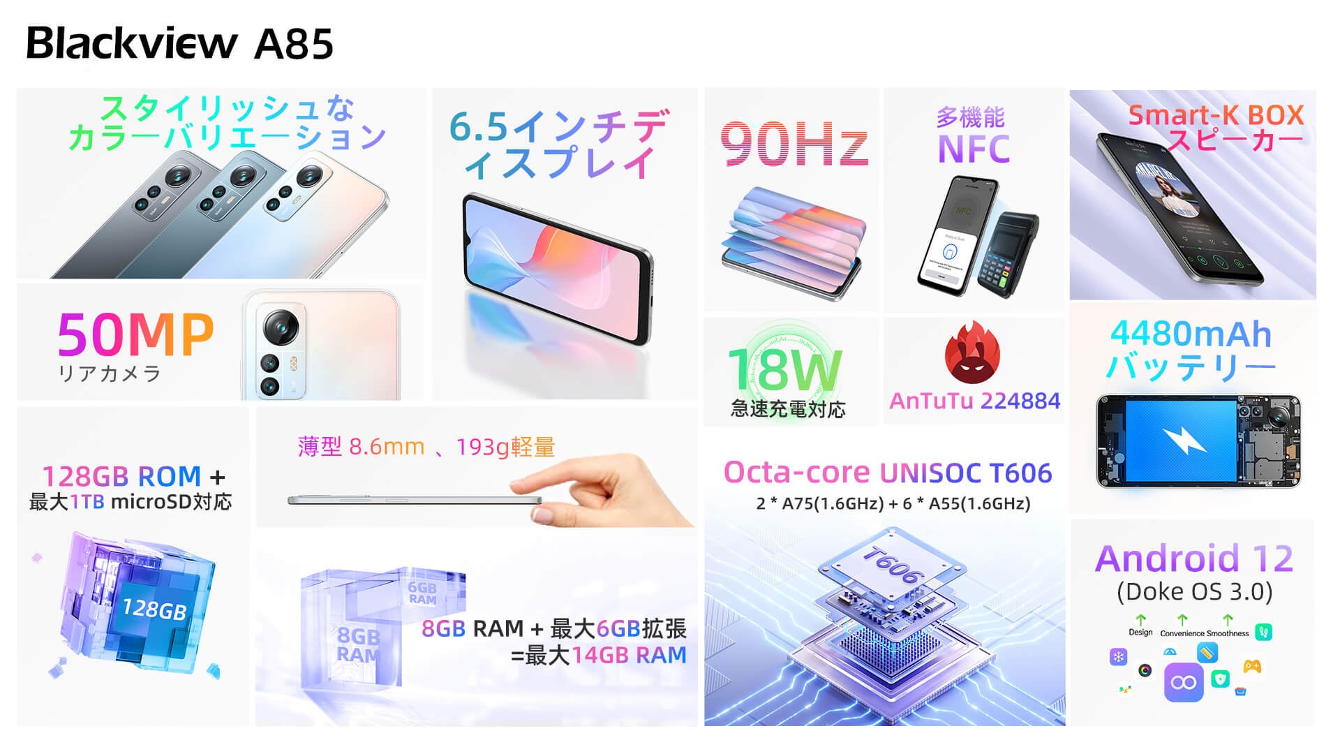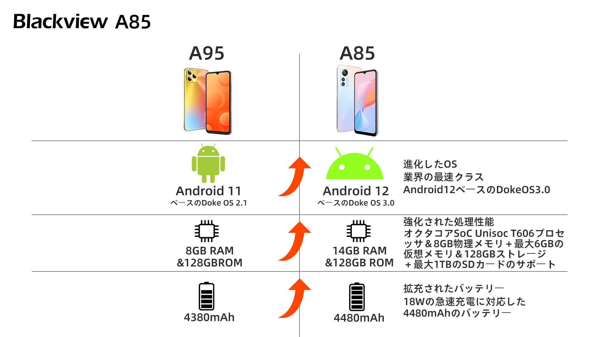 事実として前身のBlackview A95からA85になることで、 Android 11ベースの Doke OS 2.1から12ベースのDoke OS 3.0 にアップグレードされており、この世代の魅力をさらに高めています。