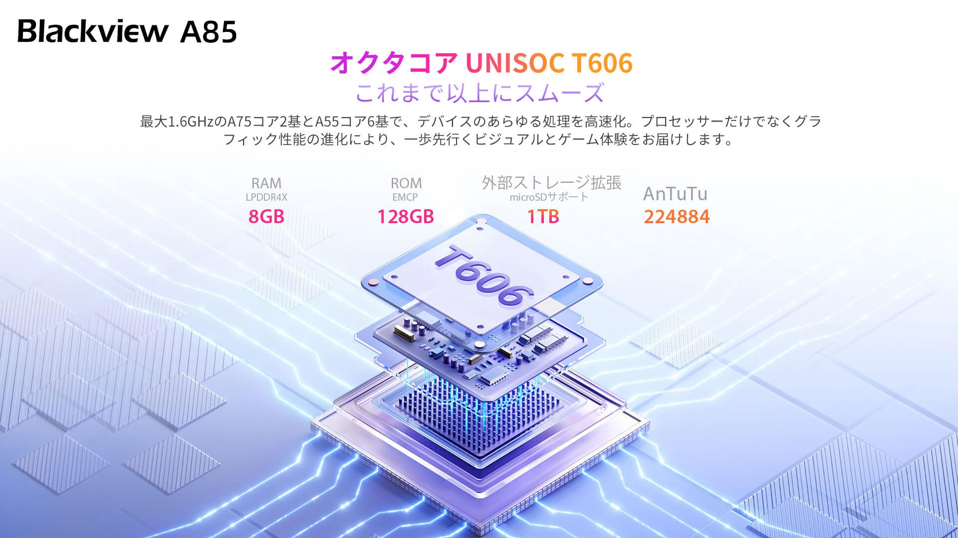 Blackview A85にはG57 1*Core (650MHz) GPUを搭載した、オクタコアSoCであるUNISOC T606が採用されています。