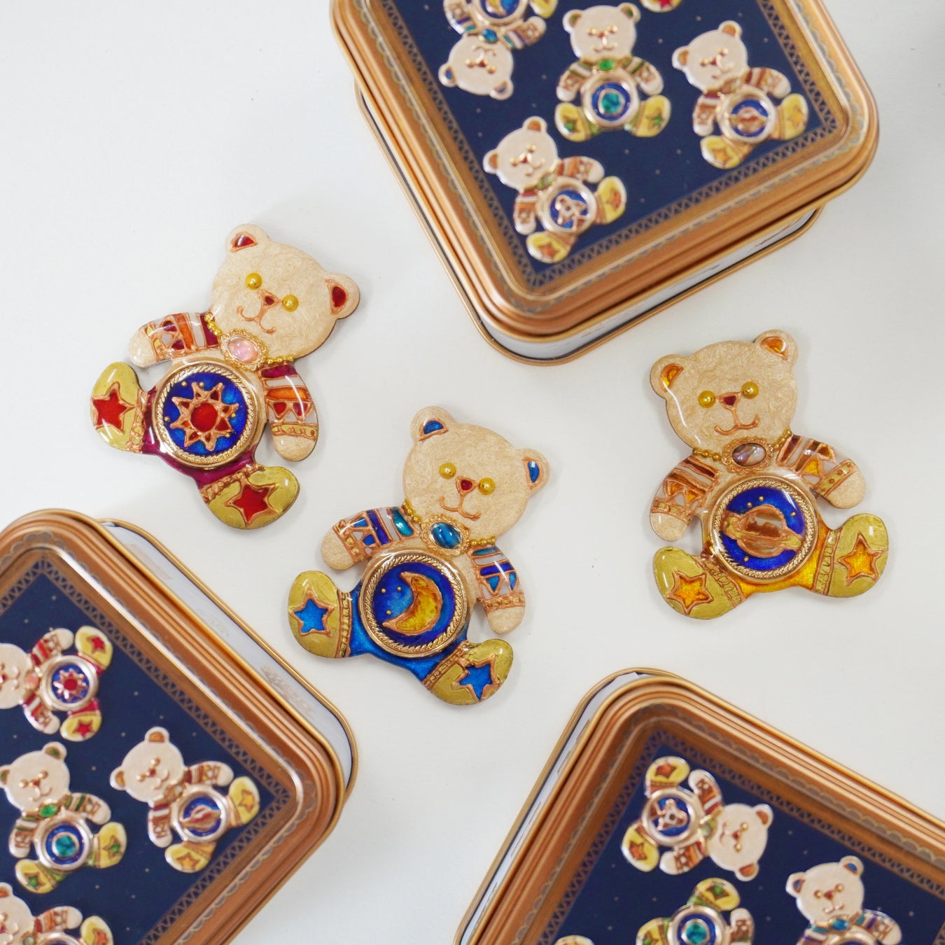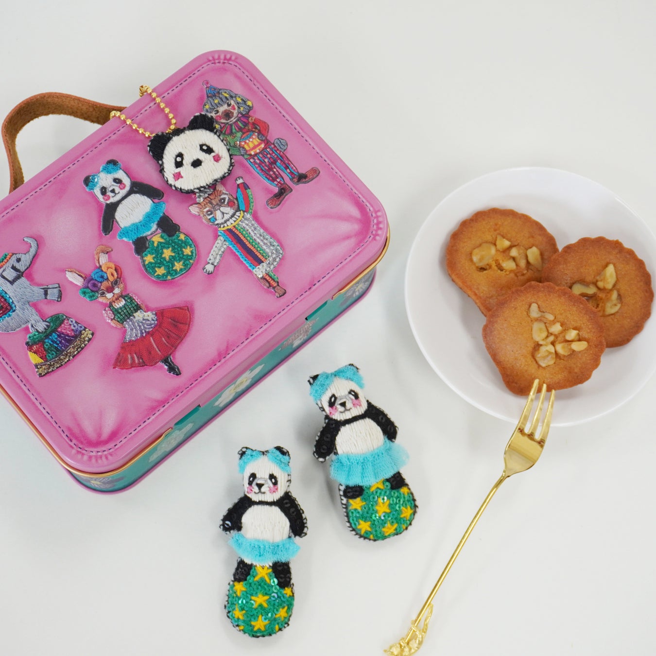 【お菓子缶のモチーフとなった手作りの"玉乗りパンダ"や"宇宙くま"ブローチ】